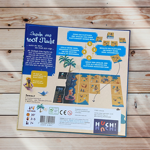 Hallo ihr Lieben. Der Herbst ist da und bei uns beginnt wieder die schöne Zeit der Spielenachmittage und -abende mit Verwandten und Freunden. Liebt ihr auch die Märchen aus 1001 Nacht mit den spannenden Abenteuern von Sindbad? Bei HUCH! ist ganz neu das zauberhafte Familienspiel „Inseln aus 1001 Nacht“ erschienen, in dem die Kinder von Sindbad im Mittelpunkt stehen. Sie haben das Ziel, alle Inseln aus den Geschichten von 1001 Nacht zu besuchen und sich die wertvollen Schätze von Sindbad wie Edelsteine, Wunderlampen und exotische Tiere zurückzuholen. Doch sie müssen bei ihren Reisen sehr vorsichtig sein,denn Gefahr lauert überall durch Räuber. Empfohlen wird das Spiel für 2-5 Spieler ab 7 Jahre. Als Spieldauer sind ca. 30 Minuten angesetzt.