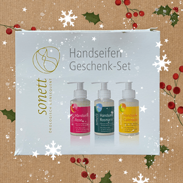 Und wer seine Lieben zu Nikolaus oder Weihnachten überraschen möchte: Sonett bietet auch ein hübsches Handseifen-Geschenkset mit 3 verschiedenen Duftnoten ( Rose, Rosmarin, Calendula ,je 110 ml) an: