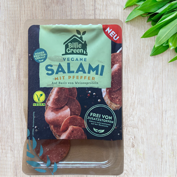 Ich möchte euch heute die Vegane Salami mit Pfeffer (70 g) vorstellen, die wir als erstes Produkt von Billie Green verkostet haben: