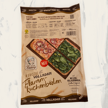 Die knusprigen Tante Fanny Vollkorn Flammkuchenböden sind eine super Alternative zu Pizza. Man kann sie klassisch herzhaft oder auch süß belegen – Flammkuchen-Fans kommen hier bestimmt auf ihre Kosten. Der vegane Teig ist ballaststoffreich und palmfrei. Launch Oktober 2022 – 340 gr. UVP 3,29 Euro