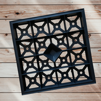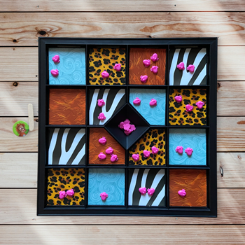 Bevor das Spiel beginnen kann, muss man erst die Spielfeld-Elemente nach einem vorgegeben Schema in den schwarzen Rahmen einsetzen. Dort können sie bis zum nächsten Spiel verbleiben.
