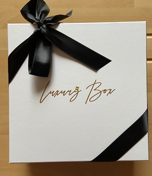 Die Luxury Box sieht mit ihre klassischen Design in Schwarz-weiß und dem goldfarbenen Schriftzug sehr edel aus. Eine schicke schwarze Schleife verstärkt den hochwertigen Eindruck.