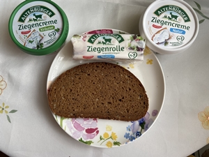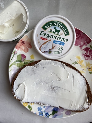 Als erstes haben wir die Ziegencreme Natur auf einem frischen Vollkornbrot probiert: