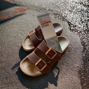 Mit der Gerlachs Gehwol Fusskrem pflege ich strapazierte Füße und stark beanspruchte Haut. Die Fusskrem ist seit 1882 das Mittel der Wahl zur Verhütung von Wund- und Blasenlaufen – dazu trägt man die Kreme vor langen Wanderungen/Joggingrunden dick auf Fußsohlen, Fersen und Zehen auf. Dort bildet sich nach dem Auftragen eine zähe Schutzschicht. Auch stark beanspruchte Hände werden wieder weich und geschmeidig.