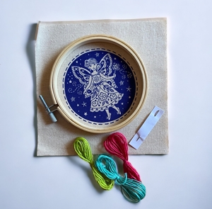 Das Set enthält ein 16 seitiges Anleitungsbuch, einen kleinen Baumwollstoff mit vorgedrucktem Stickmuster Fee, Stickgarn in drei Farben, einen Bambusstickrahmen und eine Nadel.