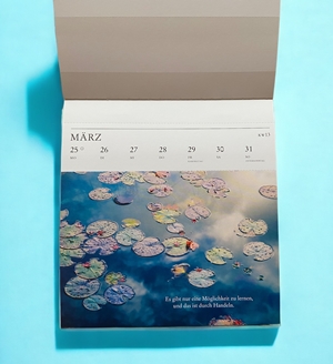 Jedes Kalenderblatt/jede Postkarte zeigt eine inspirierende Landschaft und ist mit einem Zitat von Paulo Coelho versehen, das zum Nachdenken über das eigene Leben anregt. Zum einfachen Heraustrennen der Postkarten ist jede mit einer Perforation versehen – so kann sie nicht kaputt gehen.