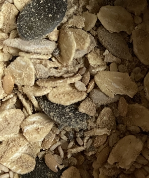 Das Müsli enthält nur natürliche Zutaten wie Haferflocken, Sesam, Leinsamen, Chia, Sonnenblumenkerne, Kürbiskerne, Rohrohrzucker, und Gewürze.
