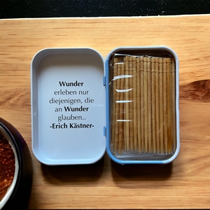 Wunder-Zahnstocher in der praktischen Metallbox sind prima, um sie unterwegs immer dabei zu haben.
