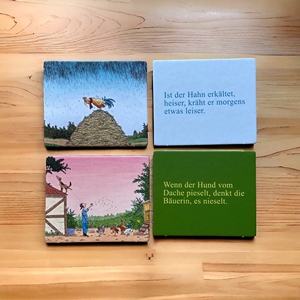 Philip Waechter und Moni Port haben alte Bauernregeln witzig interpretiert und sich zusätzlich neue Bauernregeln ausgedacht. Das Memo enthält 48 Karten und einen kleinen Misthaufen sowie einen erkälteten Hahn zum Zusammenstecken.
