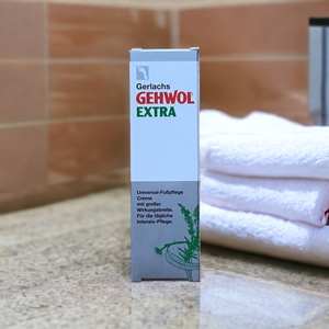 Die Creme desodoriert und desinfiziert, außerdem verhindert sie wirksam Fußpilz, Fußgeruch, Hornhaut, Fußbrennen und die Entstehung von Blasen. Sie macht trockene und rissige Fußhaut wieder schön weich und geschmeidig. Dafür sorgen natürliche GEHWOL EXTRA-Öle aus Eukalyptus, Rosmarin, Lavendel und Thymian. Diese Wirkstoffe regen auch die Durchblutung an, so dass auch bei kaltem Wetter die Füße schön warm bleiben.