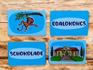 Das Spiel ist nicht so einfach, wie es auf den ersten Blick erscheint, denn hier ist sehr schnelle Reaktion gefragt. Bei den Bilderkarten werden Oberbegriffe gesucht und dazu das Wort auch rückwärts geschrieben. Viele Wörter sehen sehr ähnlich aus – da muss man sich richtig konzentrieren. Verwirrung stiften zusätzlich die verschiedenen Bilder eines Paares. Uns hat das Spiel viel Spaß gemacht, denn es fordert gleichzeitig schnelle Reaktion und bildliche Vorstellung. Mit der kleinen Verpackung lässt sich das Spiel auch bequem transportieren.