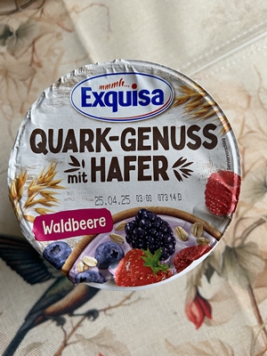 Exquisa Quark-Genuss mit Hafer enthält cremig gerührte Quark-Joghurt-Creme mit glutenfreiem Hafer und Früchten. Dabei enthält er wenig Fett und viel Protein. Den Quark-Genuss mit Hafer gibt es in zwei Sorten: Pfirsich und Waldbeere.