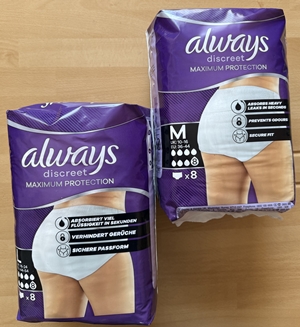 In unserem großen Testpaket befanden sich mehrere Packungen Always Discreet Maximum Protection Höschen Gr. M + L.