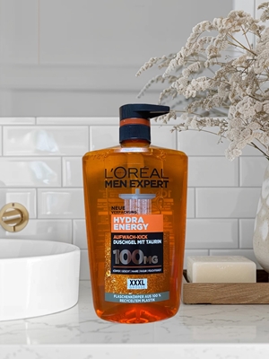 Das Hydra Energy Taurinduschgel Aufwach-Kick von L’Oréal Paris Men Expert eignet sich für Körper, Gesicht, Haare und Rasur. Es enthält 100 mg Taurin und hat einen sehr frischen, leicht holzigen Duft.
