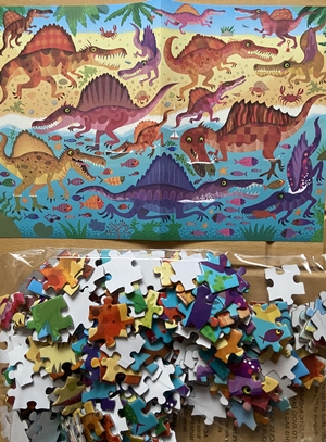 Das Dino-Puzzle zeigt viele verschiedene, bunte Dinos.. Es hat 300 recht große Puzzle-Zeile und ist so sehr gut für Kinderhände geeignet. Fertig gelegt ist das Puzzle ca. 51×40 cm groß.